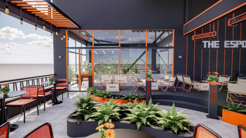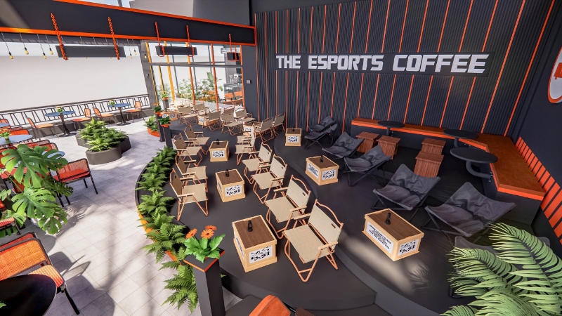 Tọa lạc tại vị trí lý tưởng trong phòng game, khu vực cafe của The Esports Stadium có không gian thoáng đãng và tầm nhìn đẹp, rất thích hợp để thư giãn sau những trận game căng thẳng. Đây là nơi lý tưởng để gặp gỡ bạn bè, trò chuyện hoặc thậm chí làm việc trong bầu không khí thoải mái.